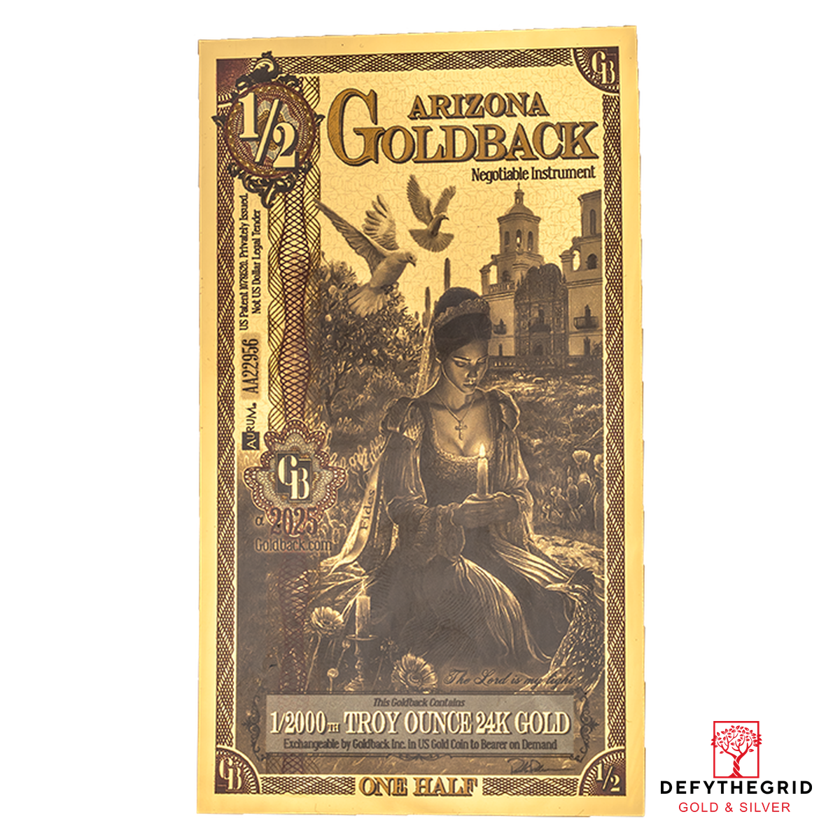 This design weaves together themes of faith, resilience, and heritage, anchored by the guiding scripture from Psalms 27:1: “The Lord is my light.” The Arizona 2025 ½ Goldback is more than a tribute to history—it honors the enduring spirit of faith that continues to illuminate the state’s journey.