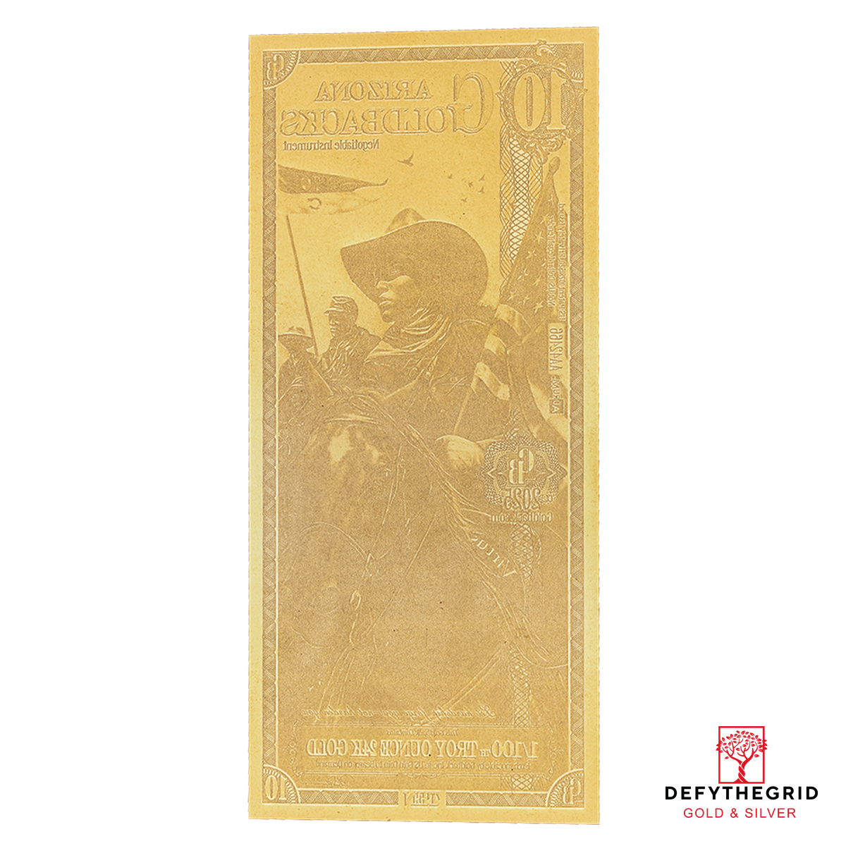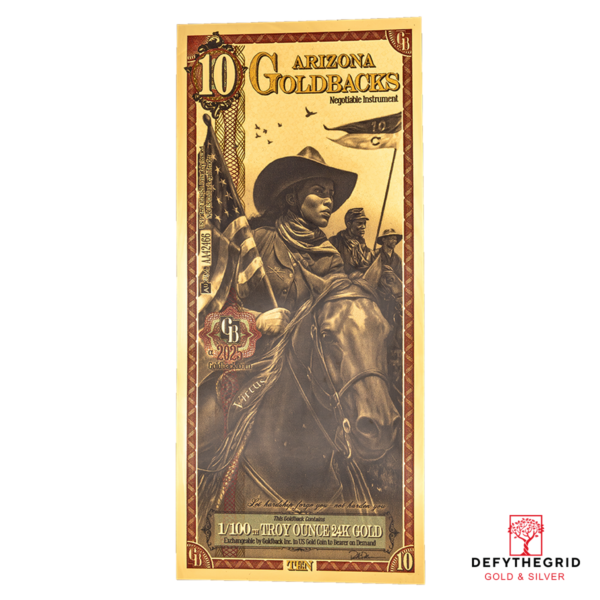 The Arizona 10 Goldback celebrates the virtue of Virtus—Strength, Courage, and Bravery—through a powerful tribute to the Buffalo Soldiers of the 10th Cavalry Regiment. Stationed at Fort Huachuca in southern Arizona, these soldiers were pioneers of resilience and service, patrolling rugged frontiers, protecting settlers, and helping build the infrastructure that connected remote outposts across the American West.