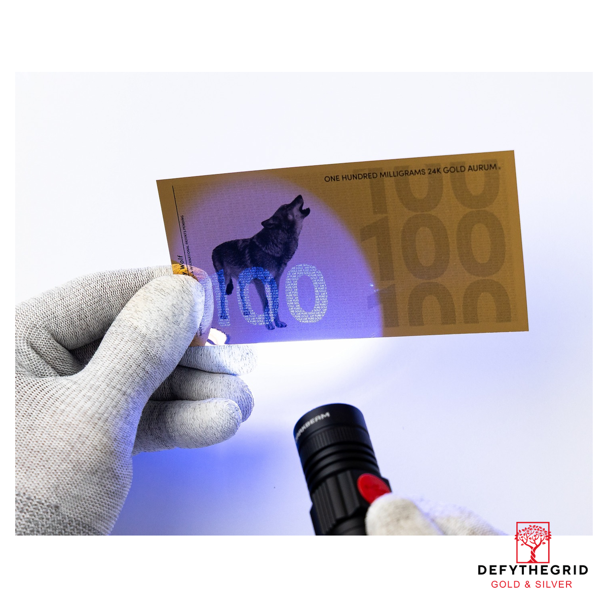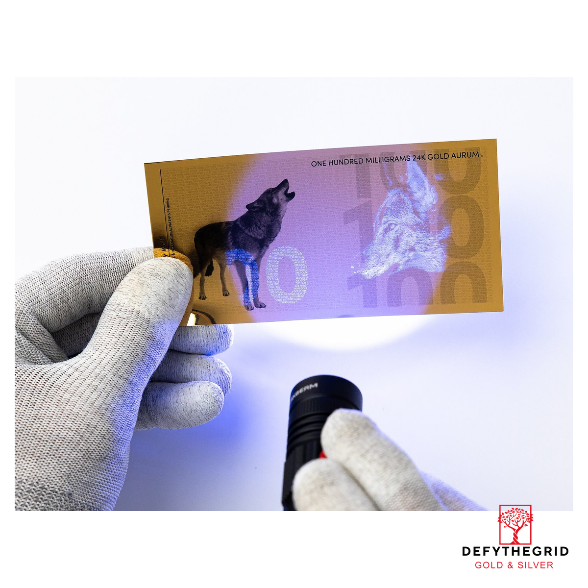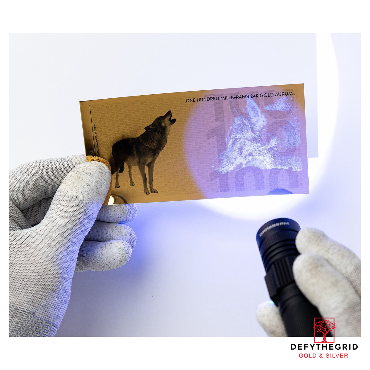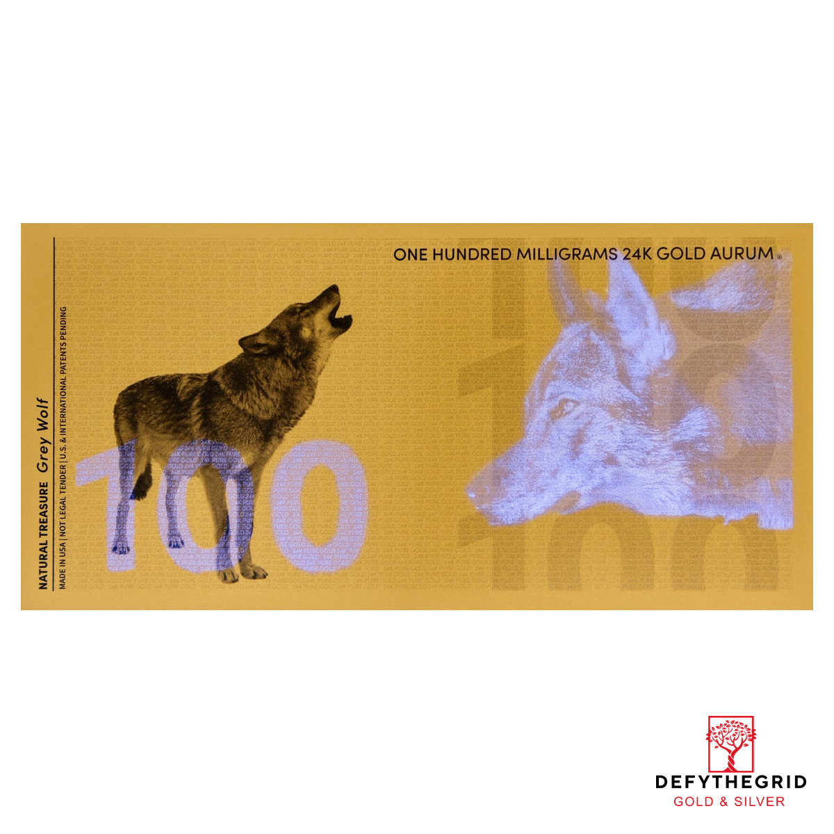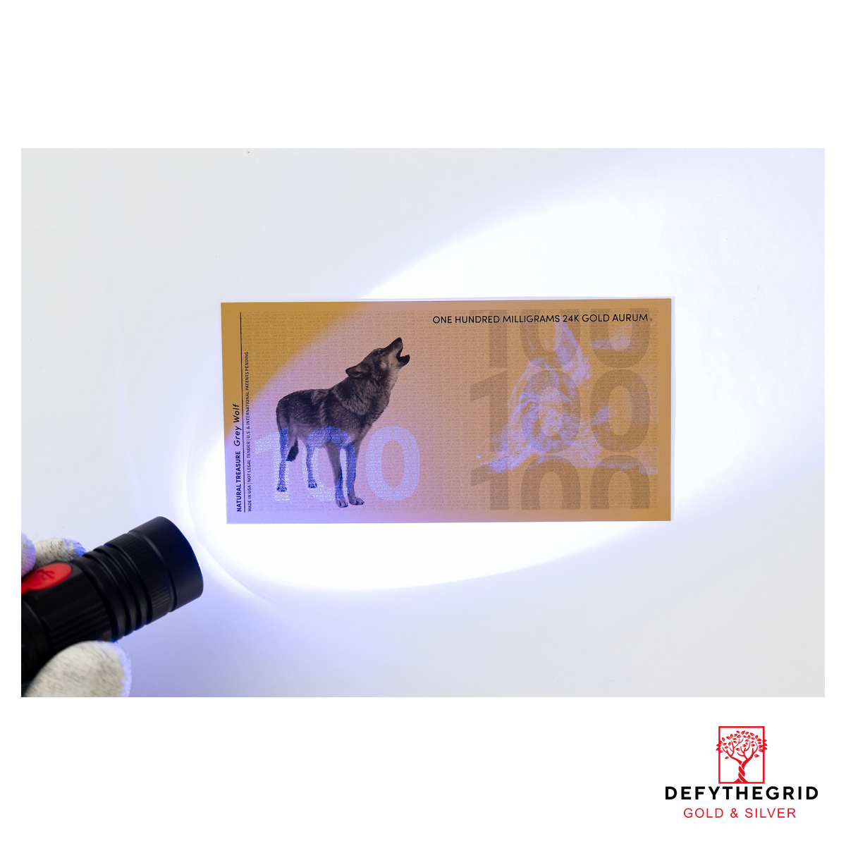 The 100 milligram North American Gray Wolf Aurum® is the third-smallest bill in our Natural Treasure series. A modern take on classic themes, this bill showcases the far-roaming, resourceful wolf in its native landscape. Multiple levels of micro-printing and security elements have been embedded throughout the artwork.