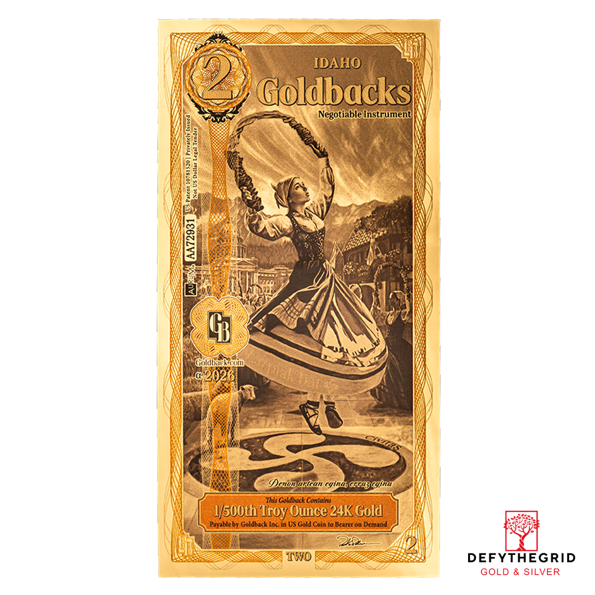 The Idaho 2 Goldback celebrates the virtue Civitas, symbolizing the strength of community and shared purpose. The artwork highlights the rich cultural heritage of Boise’s Basque community, one of the largest and most vibrant Basque populations in the United States.
