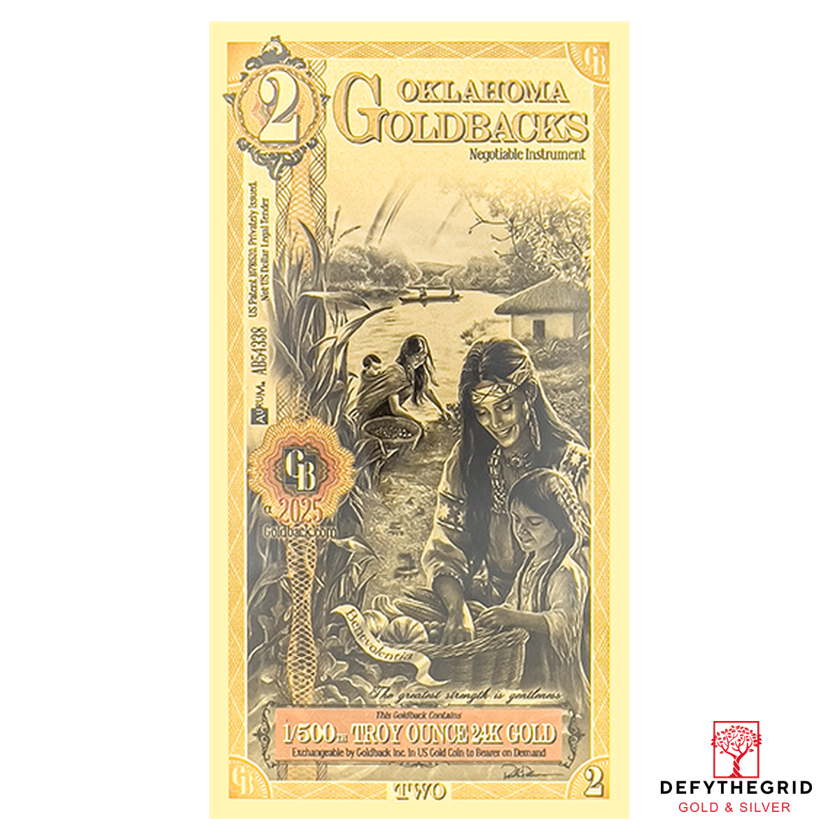 The Oklahoma 2 Goldback honors the virtue of Benevolentia—Kindness, as lived and passed down by generations of Indigenous women. The scene unfolds in the fertile river valleys of Tahlequah, the capital of the Cherokee Nation, and pays tribute to the wisdom, generosity, and quiet resilience of Native matriarchs whose guidance has long shaped tribal life.