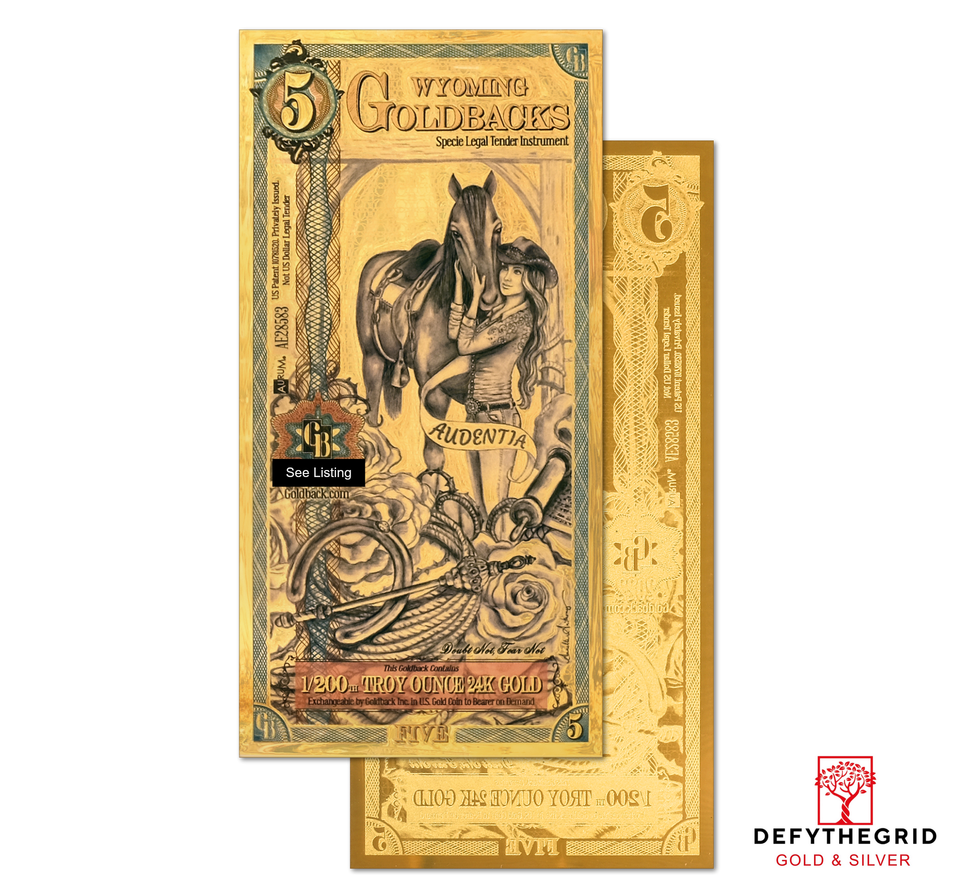 The Wyoming 5 Goldback celebrates Audentia, the virtue of boldness, through the story of a newly crowned rodeo queen, poised with her loyal horse against the wide-open skies of the West. She embodies confidence, strength, and grace under pressure, reminding viewers that courage is as much about presence and composure as it is about daring action.