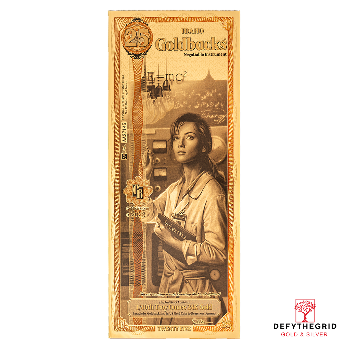 At the center of the Idaho 25 Goldback design stands a female scientist, representing Idaho’s contributions to science and engineering, as well as the many women who have played essential roles in advanced research and technological progress.