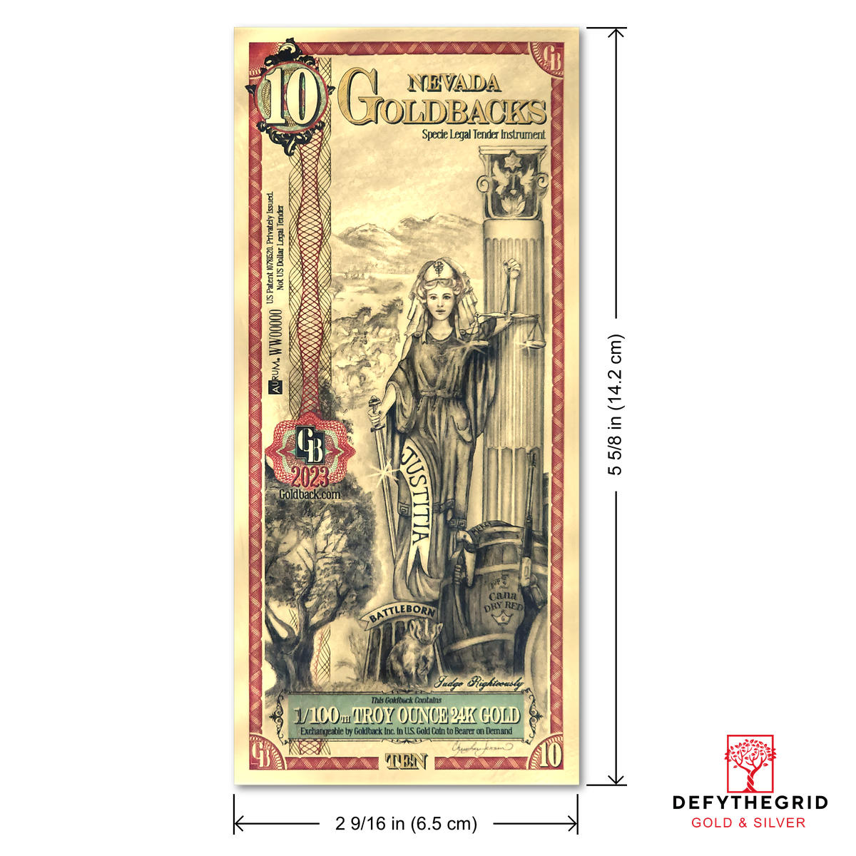 Justitia, the embodiment of Justice, makes her second appearance in the Goldback series on Nevada’s 10 Goldback note. Inspired by the statue of Justice atop the historic Storey County Courthouse in Virginia City, this depiction shows her veil drawn back, symbolizing transparency and the belief that justice should be seen and known by all. Her open eyes reflect vigilance and moral clarity: nothing escapes her notice.