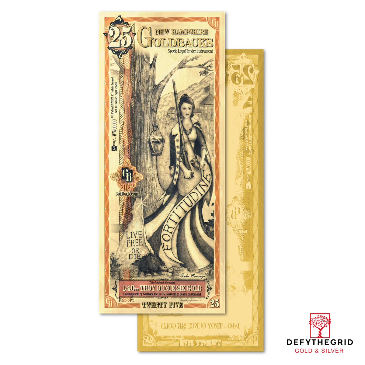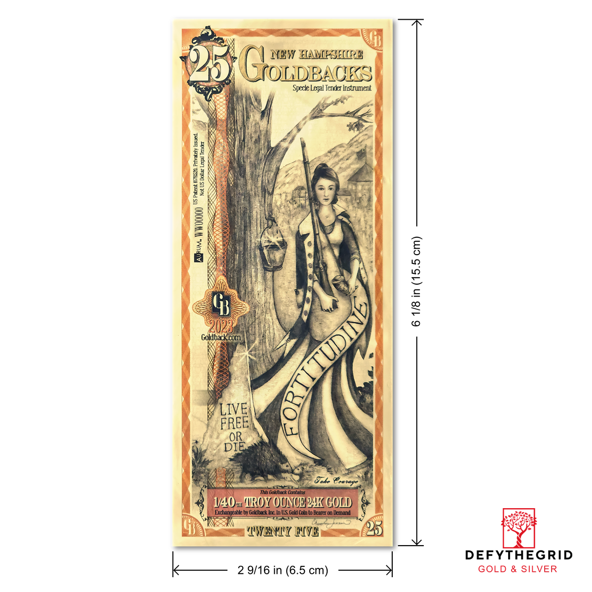The New Hampshire 25 Goldback brings Fortitudine, the personification of fortitude, to life amid the rugged landscapes of the Granite State. She wears a Minuteman’s military coat over a colonial-style dress striped in red and white, evoking the revolutionary banners that would inspire the stars and stripes of the United States. A musket rests over her shoulder, and a powder horn hangs at her side—symbols of the supplies seized during the historic Fort William and Mary raids. Nearby, a granite monument bears New Hampshire’s resolute motto: “Live Free or Die.”