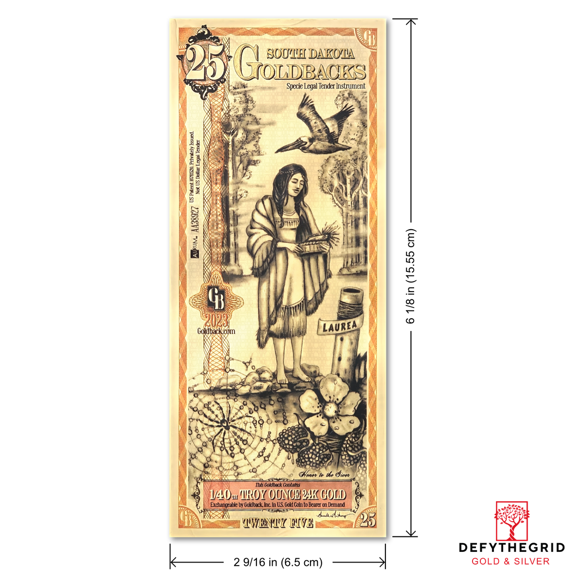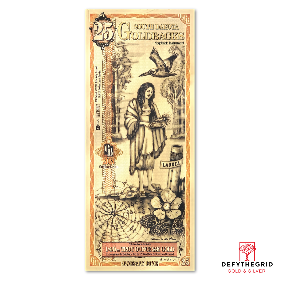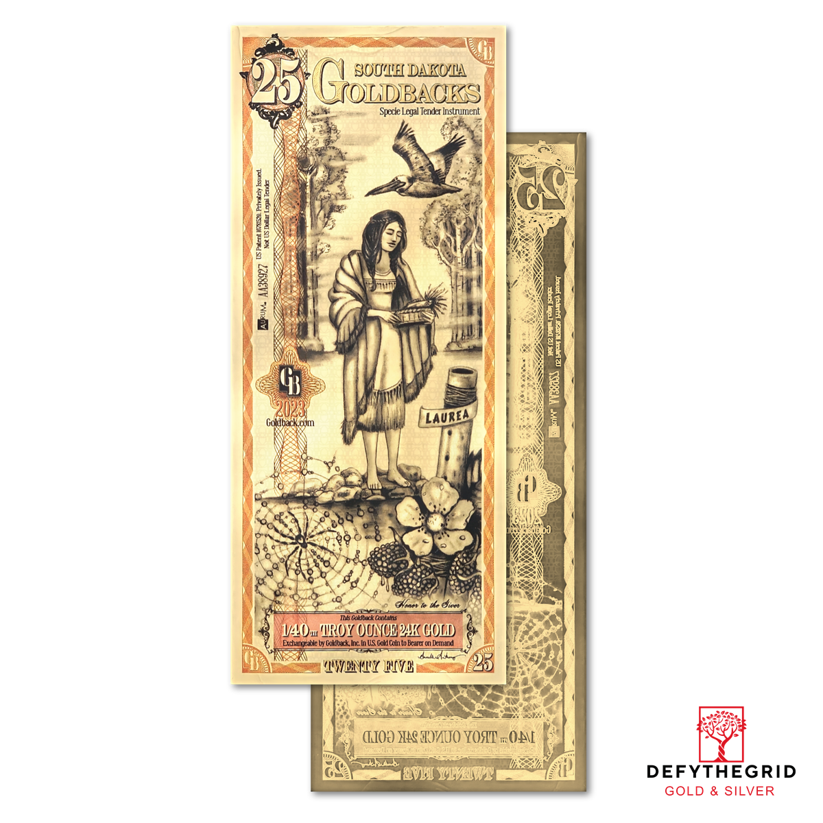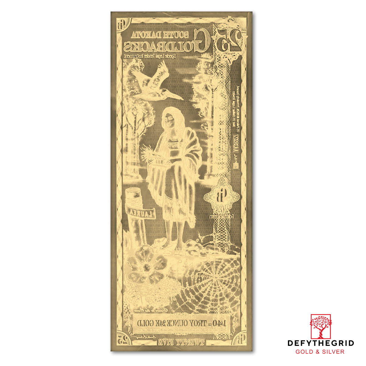 The South Dakota 25 Goldback celebrates Laurea—Honor—through a poignant tribute to loyalty, integrity, and steadfast devotion. The design draws inspiration from the legend of Maiden’s Isle on Lake Kampeska, where Minnecotah, a young woman of courage and virtue, remained true to her love despite the pressures of rival suitors. Her story became a symbol of quiet resilience, cleverness, and moral strength.