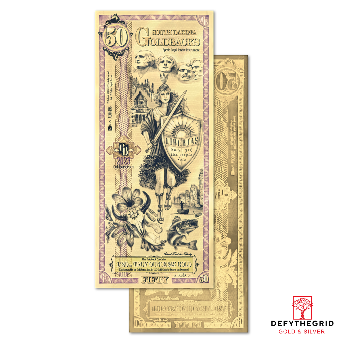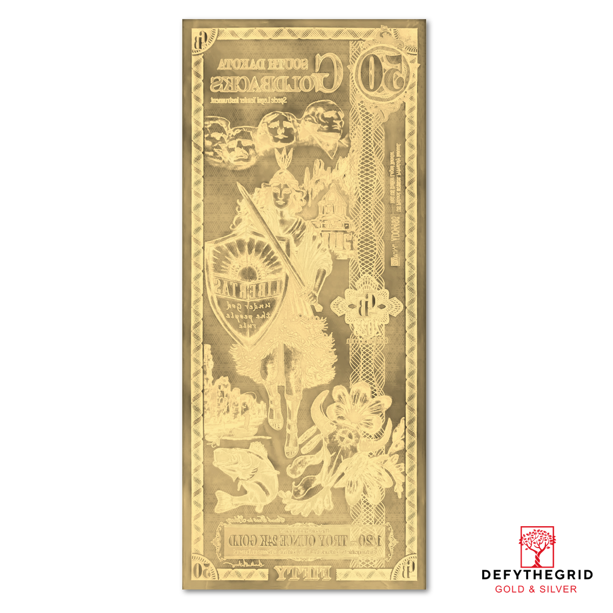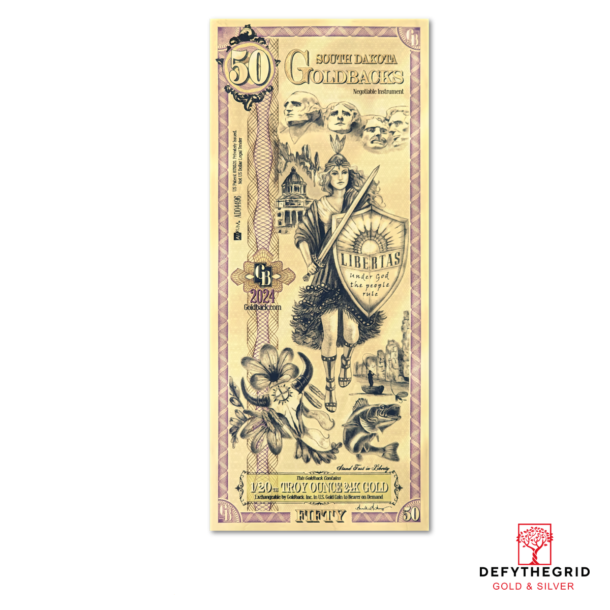 The South Dakota 50 Goldback honors Libertas—Liberty—through a commanding depiction of freedom, courage, and vigilance. As the culminating virtue of the U.S. Goldback series, she embodies the timeless ideals of liberty, justice, and civic responsibility, rooted both in classical symbolism and South Dakota’s rich heritage.