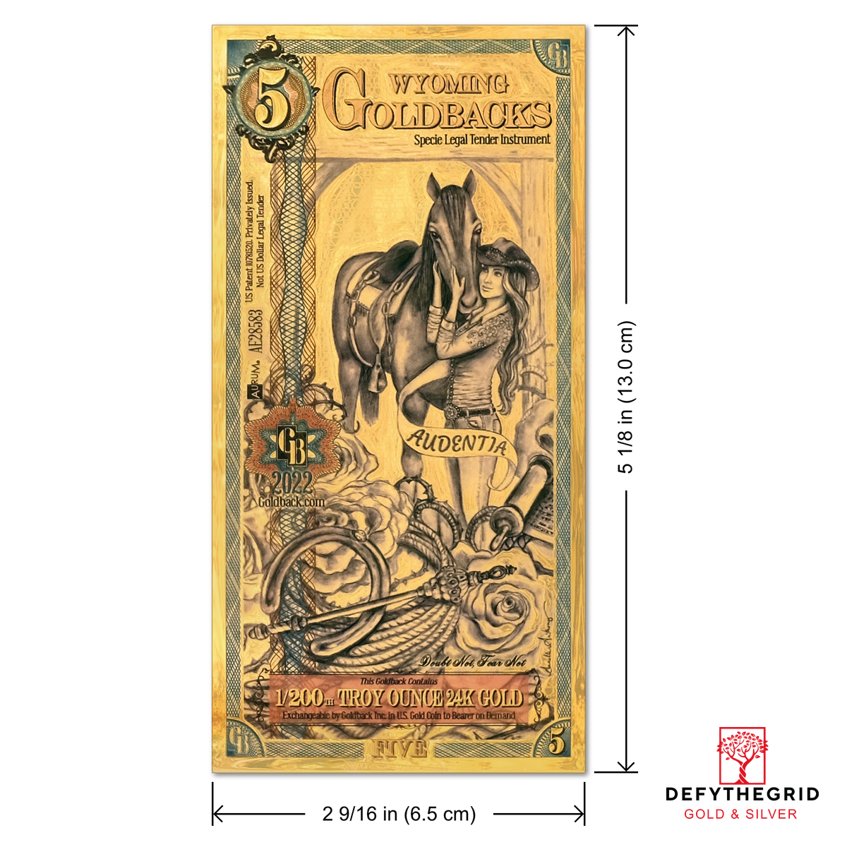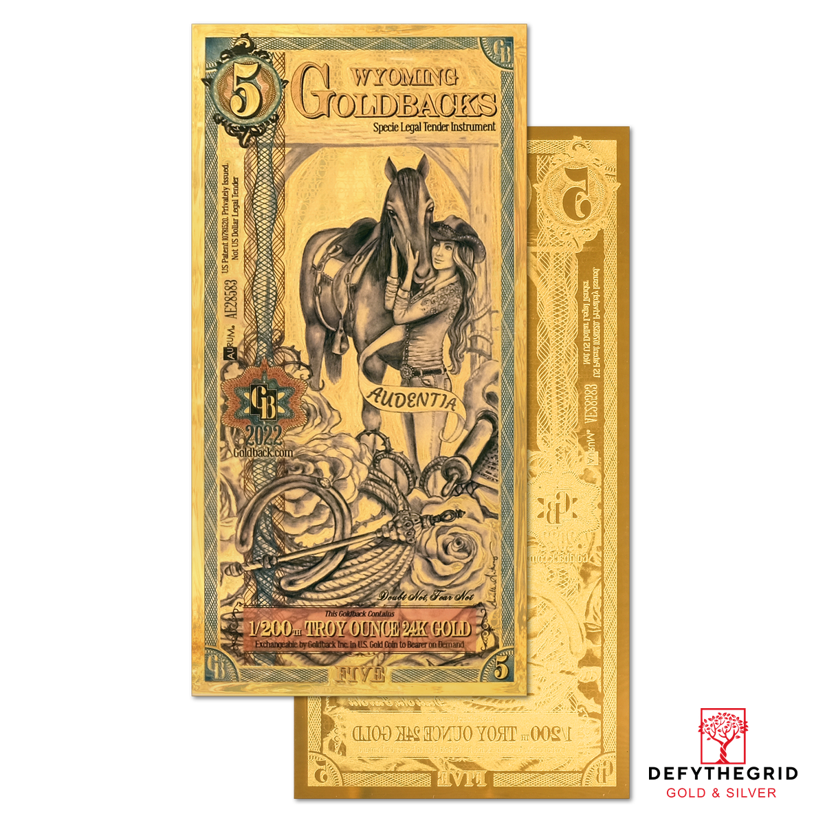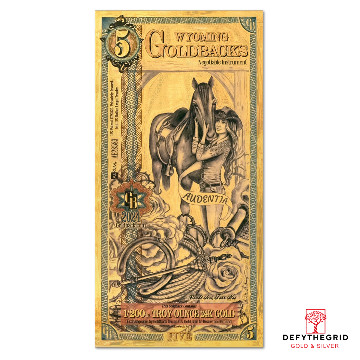 The Wyoming 5 Goldback celebrates Audentia, the virtue of boldness, through the story of a newly crowned rodeo queen, poised with her loyal horse against the wide-open skies of the West. She embodies confidence, strength, and grace under pressure, reminding viewers that courage is as much about presence and composure as it is about daring action.